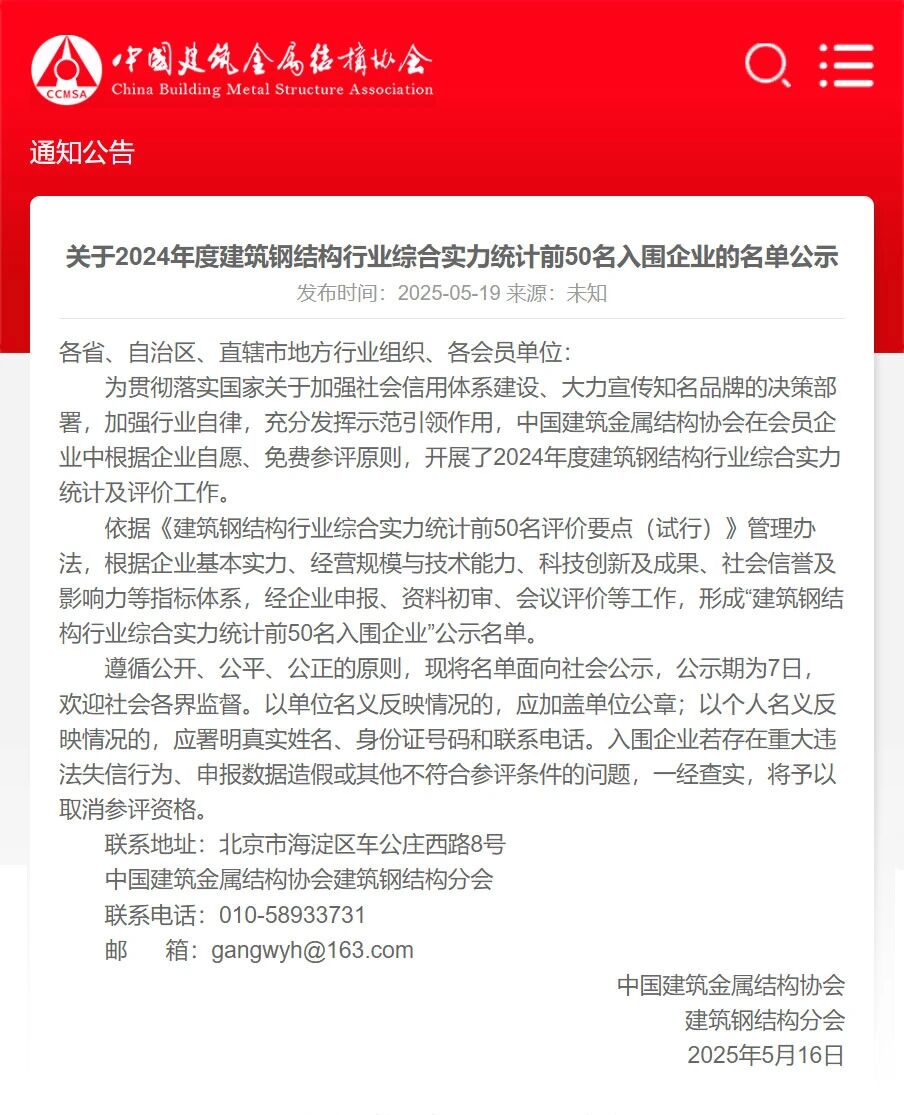 為貫徹落實(shí)國家關(guān)于加強(qiáng)社會(huì)信用體系建設(shè)、大力宣傳知名品牌的決策部署,加強(qiáng)行業(yè)自律,充分發(fā)揮示范引領(lǐng)作用,中國建筑金屬結(jié)構(gòu)協(xié)會(huì)在會(huì)員企業(yè)中根據(jù)企業(yè)自愿、免費(fèi)參評(píng)原則,開展了2024年度建筑鋼結(jié)構(gòu)行業(yè)綜合實(shí)力統(tǒng)計(jì)及評(píng)價(jià)工作。依據(jù)《建筑鋼結(jié)構(gòu)行業(yè)綜合實(shí)力統(tǒng)計(jì)前50名評(píng)價(jià)要點(diǎn)(試行)》管理辦法,遵循公開、公平、公正的原則,根據(jù)企業(yè)基本實(shí)力、經(jīng)營規(guī)模與技術(shù)能力、科技創(chuàng)新及成果、社會(huì)信譽(yù)及影響力等指標(biāo)體系,經(jīng)企業(yè)申報(bào)、資料初審、會(huì)議評(píng)價(jià)等工作,形成“建筑鋼結(jié)構(gòu)行業(yè)綜合實(shí)力統(tǒng)計(jì)前50名入圍企業(yè)”公示名單。